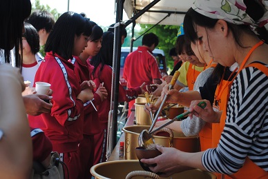 愛情のこもった栄養満点のめった汁に感激し、「おいしい!おいしい!」と笑顔で何杯もお代わりする生徒がたくさんおり、親の暖かさを感じたひとときでした。