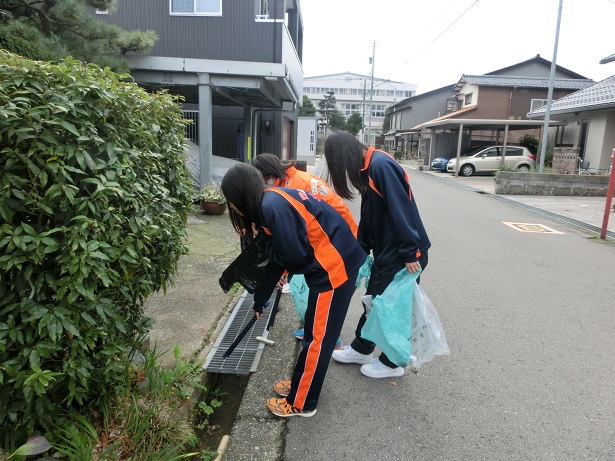 「施設清掃ボランティア」で保育園や公民館などの7施設を訪問した生徒は、窓ふきや床の掃除、草むしり等を行いました。それ以外の生徒は、約1時間をかけて「通学路清掃ボランティア」に取り組み、通学路や校舎周辺でゴミ拾いや清掃を行いました。生徒たちにとっては、ボランティア精神や自主性を養う格好の機会となりました。