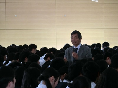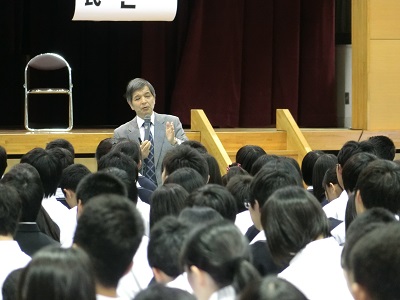 「総合的な学習の時間」では、1学期に大学や、学部・学科について調べ学習をしています。2学期には、一人一人、文系へ進むか、理系へ進むか、選択しなければなりません。前向きな選択ができるように、今日の話を生かしてほしいと思います。