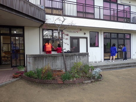 「施設清掃ボランティア」で保育園や公民館などの5施設を訪問した生徒は、窓ふきや床の掃除、草むしり等を行いました。