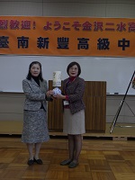 歓迎会では、本校の江尻校長が中国語で、二水高校生徒代表は英語で歓迎の挨拶をしました。それに対し、陳校長は英語と中国語で、新豊高級中学の生徒代表は日本語で挨拶をされました。友好の印として両校校長が記念品の交換を行いました。