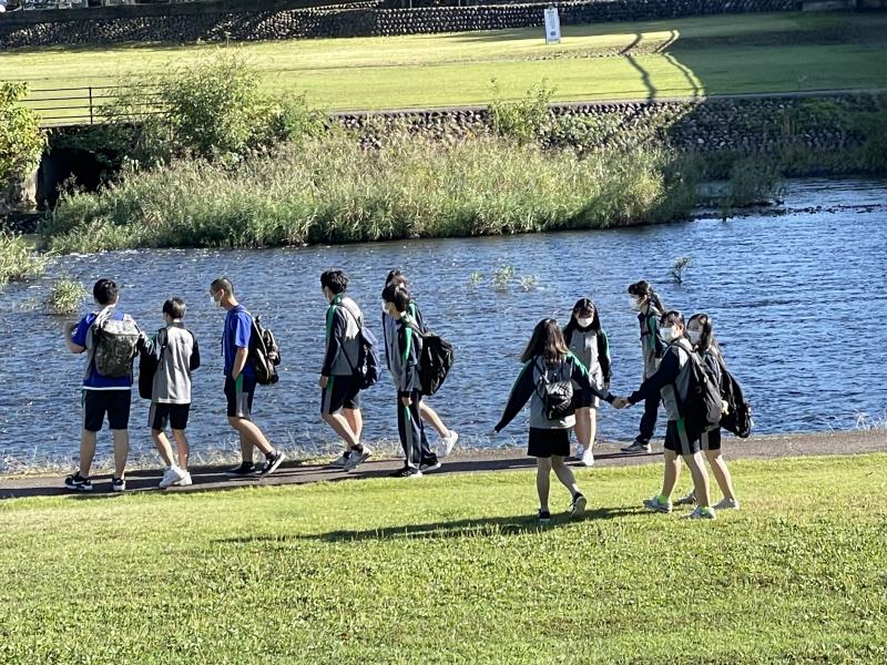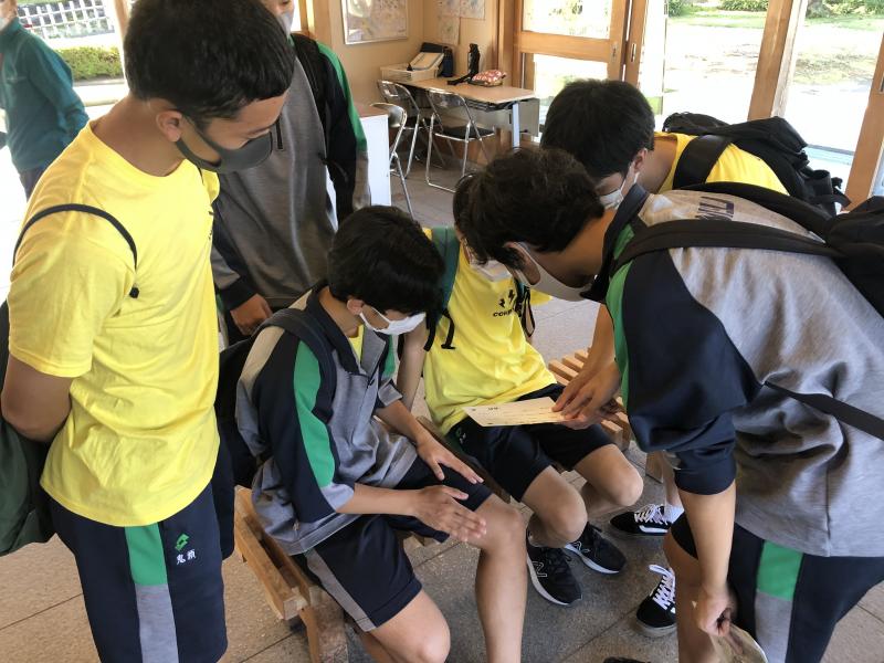 1年生は金沢城公園まで徒歩で移動し、金沢城公園内でクイズ大会を行いました。金沢城公園内に隠れている教員を探し、その教員が持っている問題を解いていくというルールのもと、生徒たちは公園内を散策しながら問題を解いていきました。