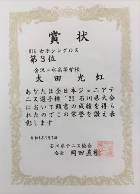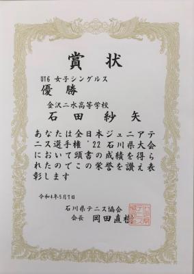 「全日本ジュニアテニス選手権’22石川県大会」において、本校の石田紗矢さんがU16女子シングルスで優勝・ダブルスでも優勝、太田光虹さんはU16女子シングルスで第3位・ダブルスで準優勝を勝ち取りました!