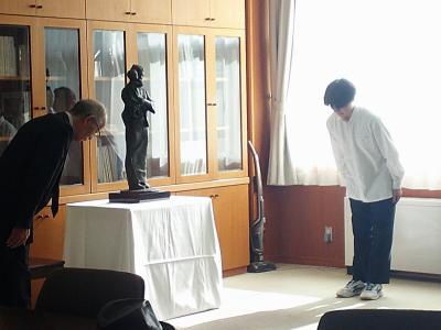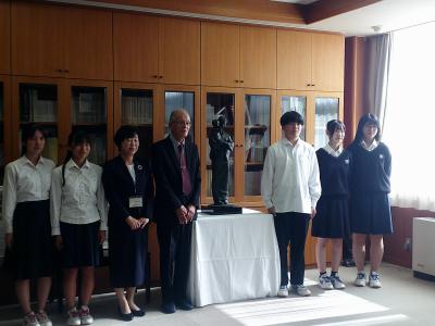 寄贈式には生徒を代表して生徒会執行部が同席しました。後期生徒会長西内くんは「この素晴らしい像を大切にしていきたい。」とお礼の言葉を伝えました。