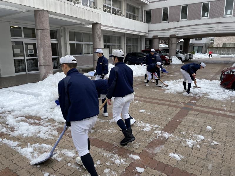 今年も12月に入り本格的に雪が降り積もりました。野球部では生徒や教職員が安全に歩行し安心して学校に登校できるよう生徒玄関や駐車場の雪かき、学校周辺の通路の確保を行っています。選手たちは自身のトレーニングも兼ねながら、ひたむきに取り組む姿は生徒や教職員、地域の方々からの感謝の言葉へと繋がっていきます。雪かき、清掃、挨拶運動など誰がやってもいいことに対して自ら率先して取り組むことができる個人・集団でありたいと考えます。仲間と協力したりコミュニケーションをとる中で達成感や充実感を味わい、他者からの「有難う」の一言が選手たちを強くしていきます。野球や勉強だけでなく、人として大切な要素を日々学んでいます。
