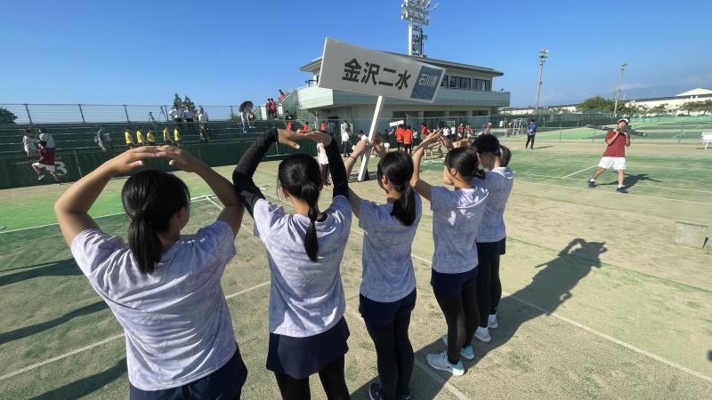 16日…団体第2回戦は富山第一高等学校。ダブルスは落としましたが、石田が勝利し、スコアは1-1となり、太田に回ってきました。序盤は有利に進めていましたが、中盤に相手が盛り返してきてゲームを連取されてしまいました。しかし、最後はしっかりと自分らしいテニスをすることができ、勝利することができました。(スコア 二水2-1富山第一)。団体第3回戦は松商学園高等学校(長野)。「自分たちのテニスをしっかりと行い、全国大会に向け長所と短所を理解するための大会であること」を試合前に確認し、挑みました。残念ながらストレートで負けてしまいましたが、昨年度の優勝校相手にも臆さずに戦うことができました。(スコア 金沢二水0-2松商高校)