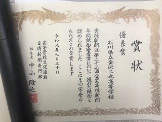 また高等学校文化連盟全国新聞専門部からは今年も全国高校新聞年間紙面審査賞にて優良賞をいただきました。
