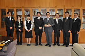 この度、アパホテル株式会社代表取締役専務元谷拓様がご来校され、同ホテルで開発されたアパ社長カレーとアパ社長ラーメン各1,200食を、防災備蓄用として御寄贈いただきました。元谷様は本校第46期生で、平成6年(1994)3月のご卒業です。寄贈式では母校への思いを熱く語っていただきました。非常時の備え等として有効に活用したいと思います。