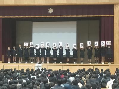 この日は「体育委員会」「メディア委員会」「掲示広報委員会」の発表のあと、6年生が「いじめ0宣言」をしました。
