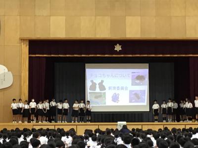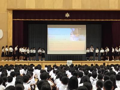この日は「体育委員会」「メディア委員会」「掲示広報委員会」の発表のあと、6年生が「いじめ0宣言」をしました。