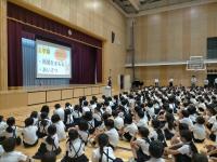 今、取り組んでいるあいさつリレーについてのお話です。野々市小学校では年間を通じて、子供たちにあいさつについての指導を行なっています。