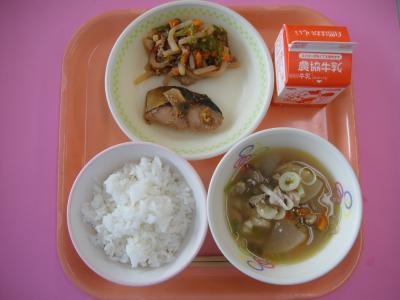 ★さばのしょうが煮をおいしく作るポイントはたくさんのしょうが、ねぎ、お酒を使うことです。配食のあとに食缶に残ったねぎまで、ごはんにのせて食べいる人が何人もいました。きんぴらもしょうが煮もしっかりとした味つけだったので、たくさんごはんをおかわりして、完食のクラスがいっぱいでした。