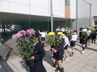 菊花協会の方々に教えてもらって、四年生が大切に育ててきた菊が大輪の花を咲かせました。今日はみんなで菊の鉢をフォルテに運びました。