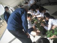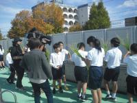 秋晴れのもと、4年生は菊花協会の皆様の指導のもと、菊の花に輪台をつけました。