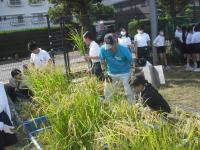 刈った稲は林さんのご指導のもとプールサイドのフェンスに天日干しをしました。