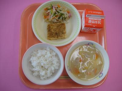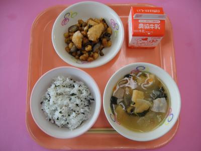 ★今日の給食には、嚙み応えがある揚げ大豆や、もちもちの豆腐白玉団子など、様々な食感を楽しめました。わかめごはんは子どもたちにも大人気で、たくさんの子がおかわりしていました。