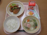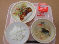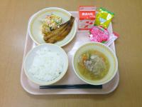 今日の給食は「ごはん、鮭のザンギ、昆布和え、どさんこ汁、ハスカップゼリー、牛乳」です。