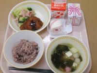 メニューは、「赤飯・ヒレカツ・花野菜サラダ・紅白すまし汁・お祝いデザート(ケーキ)・牛乳」です。