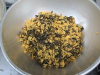 すし飯に具を混ぜています  大豆とかぼちゃ、豚肉をカラッと揚げました