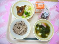 明日は卒業式です。3年生にとっては最後の給食になりました。お祝いメニューとして「赤飯・ヒレカツ・花野菜サラダ