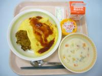 24日は給食最終日です。献立は「オムライス・マスタードチキン・クラムチャウダー・フルーツ杏仁」です。