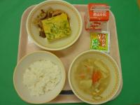 今日の給食は「ごはん・千草焼き・江戸っ子煮・揚げとじゃがいものみそ汁・ふりかけ・牛乳」です。