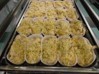 ↑ ひとつひとつカップにつめて       ↑ 焼く前のグラタン