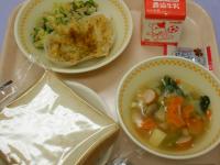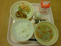 今日の給食は、「ごはん・焼きメンチ・アーモンドサラダ・クラムチャウダー・牛乳」です。
