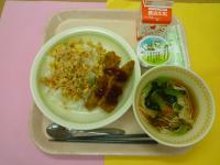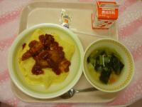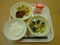 今日の給食は「友禅ごはん、ケイチャン、すったて汁、栗のムース、牛乳」です。