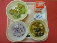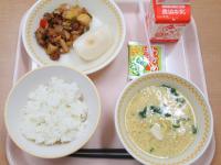 献立は「五目ごはん・豚肉とさといもの照り和え・お月見汁・お月見ゼリー・牛乳」です。