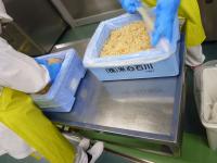 ごはんの具を計ります       ごはんを混ぜ込んでいきます