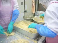 氷室ちくわ 衣をつけて揚げます ふっくら揚がりました 今日の給食