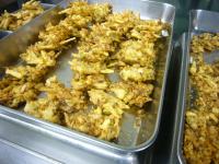 今日は「かきあげ」です。旬の「さつまいも」がたっぷり入っています。給食センターで手作りしています。野菜をカットして、小麦粉をまぶし、小麦粉と水で作った天ぷら衣をつけて油で揚げます。同じ形にはなりませんが、それぞれが手作り感があり、さつまいもがホクホクしていました。