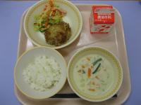 今日の給食は、「ごはん・焼きメンチ・アーモンドサラダ・クラムチャウダー・牛乳」です。