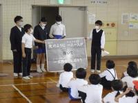 児童集会では、4月の取り組み「返事はっきりはいっ」と「授業スイッチオン」の振り返りを行い、