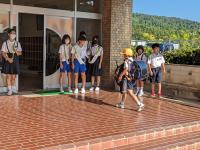 バス通学の高学年はそれぞれのバス停で集合時間に行い、徒歩通学の児童は児童玄関で行います。