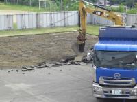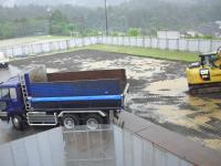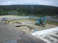 昨日、校門側に敷かれたコンクリは、昨日のうちにさらに範囲を広げ、プールの約3分の1くらいまでできてきました。