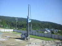 天気のいい日はやはり作業が進むのでしょうか。今日は一気にプールの底のコースごとのライン、プール周りのフェンスがつけられるであろうところに、等間隔に白いポールが立てられました。