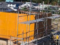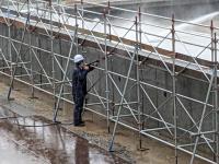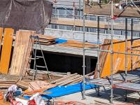 午後になって見てみると、木の枠が取り付けられたところの手前に金属の棒がたくさん立てられ、周囲は足場も組まれ始めました。