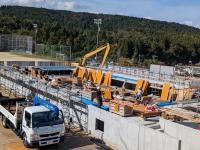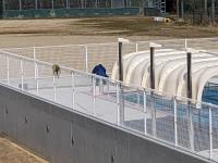 天気のいい日はやはり作業が進むのでしょうか。今日は一気にプールの底のコースごとのライン、プール周りのフェンスがつけられるであろうところに、等間隔に白いポールが立てられました。
