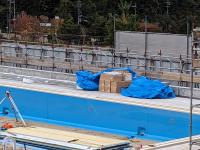 プールの工事の方は、コンクリートが乾くまでもうしばらくという感じ。見た目にはそれほど変わった感じはありません。少しプールサイドの荷物が整頓された感じで、奥の方に段ボール箱が何箱があるのが気になります。何が入っているのでしょうね。
