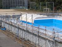 工事の方は、先日より水道関係の工事や体育館のトイレの改修工事に入っており(体育館のトイレも改修されます)、プール自体の外観に「変化」を見つけるのは難しいですが・・・何やらポールのようなものを立てている人を発見しました。何が始まるのでしょうかね。