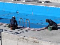 プールサイドの壁との角の部分?を丁寧に何かを塗って仕上げてくださっているようです。