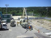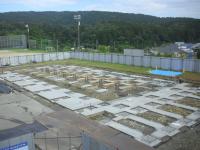 昨日、校門側に敷かれたコンクリは、昨日のうちにさらに範囲を広げ、プールの約3分の1くらいまでできてきました。
