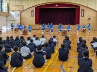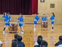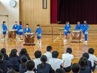 お揃いのはっぴとはちまきをした4年生が、威勢のいい声で太鼓を鳴らし、全校は迫力のある演奏に聞き入りました。