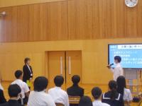 ふるさと創造プロジェクトとして2年生の修学旅行で行う「七尾の魅力発信」の活動の準備が進んでいます。7月8日(月)の総合的な学習の時間では、大阪京橋中央商店街で商品を販売する際に、商品の説明をしたり、事業所の方の商品に対する思いや復興に向けての想いを伝えたりするために、『花月』、『花嫁のれん館』、『お祭り会館』、『八太郎漬本舗』、『高澤ろうそく』、『すぎ省水産』、『能登島クラシカタ研究所』の各事業所の方をお招きしてお話を聞きました。『大根音松商店』については、後日説明を聞く予定です。
