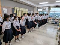 8月2日(金)に全校登校日がありました。全校集会では、北信越大会に出場する相撲、水泳の壮行式、各種大会の校納式がありました。そのあと、3年生は1学期に製作した『横断幕の設置』を、2年生は9月の修学旅行で行う『七尾の魅力発信』の準備を、1年生は課題の進捗状況の確認をしました。久しぶりに全員の子どもたちの笑顔を見ることができました。