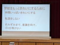 その後、校長先生からは2学期の残り10日間、「今の自分よりも成長させようと取り組んでいってほしい。それが自己指導能力につながる。自分がどんな行動をとればよいかを判断して行動する自己指導能力を高めていこう」というお話があり、具体的には、「清掃をきちんとする、時間を守る、挨拶をしっかりする」という3つを行っていこうというお話をされました。