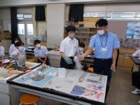 ふるさと創造プロジェクトとして2年生の修学旅行で行う「七尾の魅力発信」の活動の準備が進んでいます。7月8日(月)の総合的な学習の時間では、大阪京橋中央商店街で商品を販売する際に、商品の説明をしたり、事業所の方の商品に対する思いや復興に向けての想いを伝えたりするために、『花月』、『花嫁のれん館』、『お祭り会館』、『八太郎漬本舗』、『高澤ろうそく』、『すぎ省水産』、『能登島クラシカタ研究所』の各事業所の方をお招きしてお話を聞きました。『大根音松商店』については、後日説明を聞く予定です。