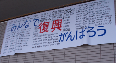 復興に向けてみんなで頑張ろうという気持ちを込めて『みんなで復興がんばろう』の横断幕をつくり、生徒玄関に掲示しました。地域の方が一生懸命復旧/復興に取り組んでいるので自分たちも地域の一員として取り組んでいきたいという思いでつくりました。生徒人一人が強い思いを持って自分の名前を横断幕に記入しました。